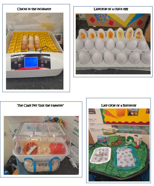 The children in Reception class are extremely excited at all the activity in the classroom. They are eagerly watching the chick eggs, only 2 weeks to go! They have the class pet ‘Gus’ the hamster that they take turns each week to take home and look after and they are also studying the life cycle of a Butterfly!