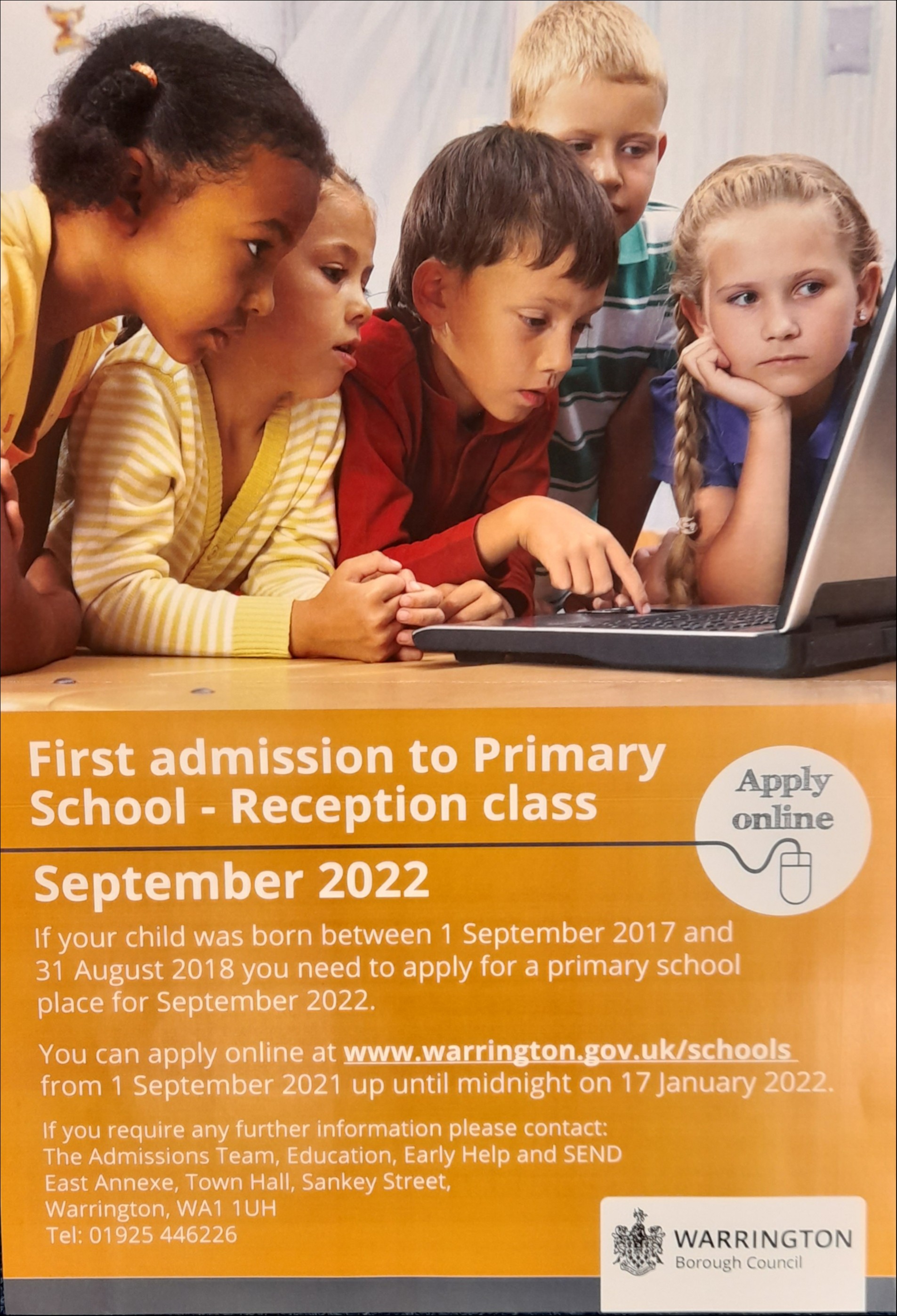 The deadline to apply is 17th January, applications need to be made online at www.warrington.gov.uk/schools.