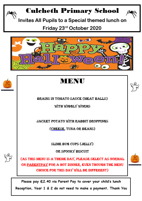 All children are invited to take part in 'Spooky Day' on Friday 23rd October. Children are welcome to dress up if they wish and we are having a themed lunch menu (see attached).